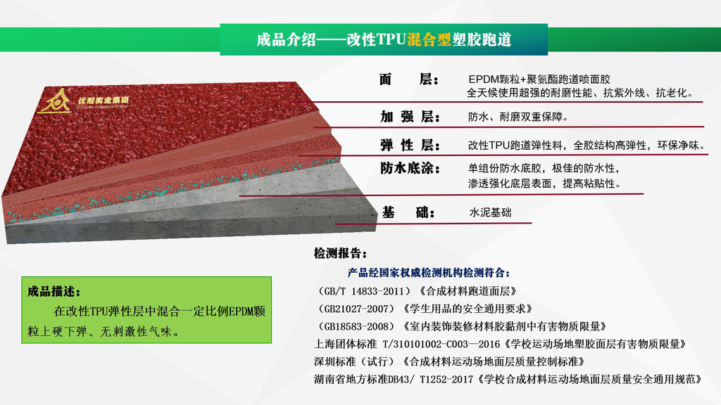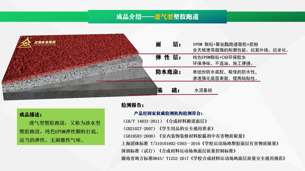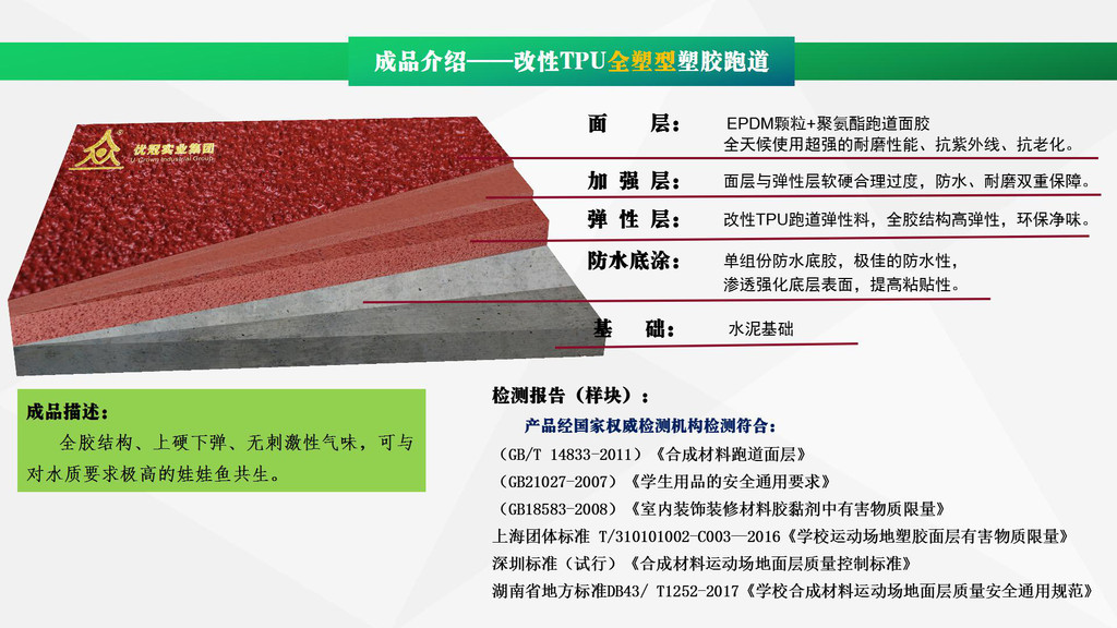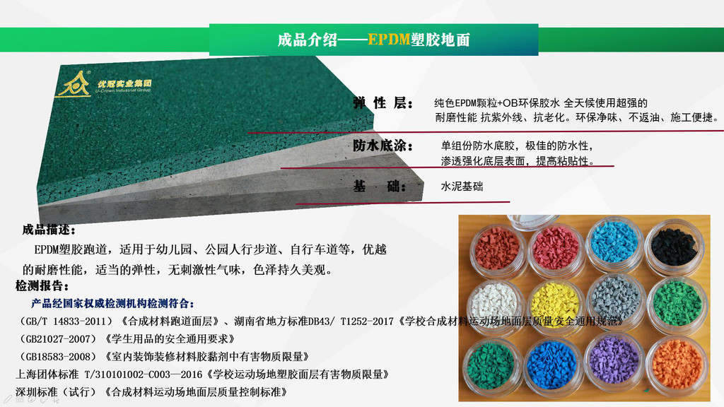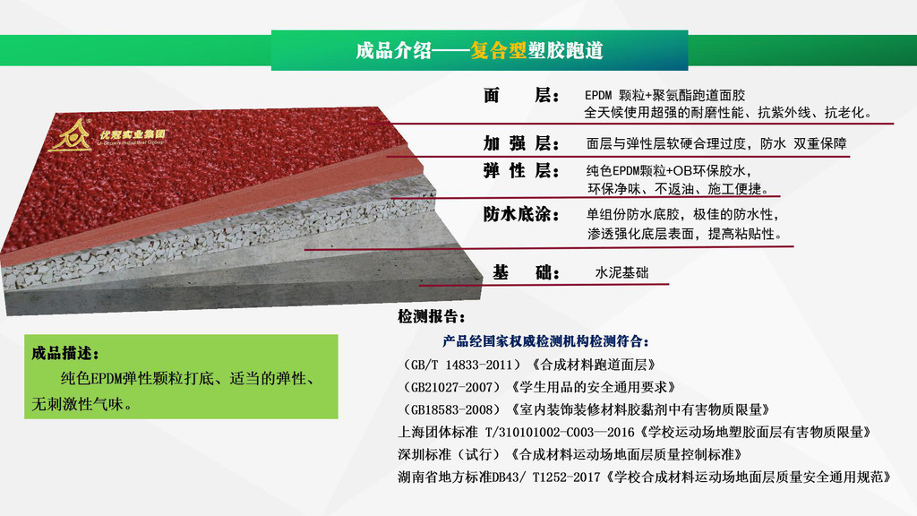 優(yōu)冠實(shí)業(yè)集團(tuán)有限公司(以下簡稱集團(tuán))是一家專業(yè)從事運(yùn)動(dòng)場地材料,人造草坪研發(fā)、生產(chǎn)、銷售、鋪裝的科技創(chuàng)新型企業(yè),是湖南省地方標(biāo)準(zhǔn)DB43/ T1252-2017《學(xué)校合成材料運(yùn)動(dòng)場地面層質(zhì)量安全通用規(guī)范》主要起草單位之一。公司具備國際田聯(lián)(IAAF)認(rèn)證、國際網(wǎng)聯(lián)(ITF)認(rèn)證、中國環(huán)境標(biāo)志產(chǎn)品認(rèn)證、中國綠色材料標(biāo)志授權(quán)使用證書、企業(yè)生產(chǎn)環(huán)評(píng)批復(fù)報(bào)告、安全生產(chǎn)標(biāo)準(zhǔn)化三級(jí)企業(yè)證書、對(duì)外貿(mào)易經(jīng)營者備案登記表等,并成為湖南省政府采購協(xié)會(huì)會(huì)員。集團(tuán)下轄湖南優(yōu)冠體育材料有限公司、五舟體育設(shè)備制造有限公司、湖南康普斯人造草坪有限公司、湖南科迪環(huán)??萍加邢薰?、湖南優(yōu)冠運(yùn)動(dòng)場鋪裝技術(shù)服務(wù)有限公司、湖南優(yōu)冠塑膠體育工程有限公司。