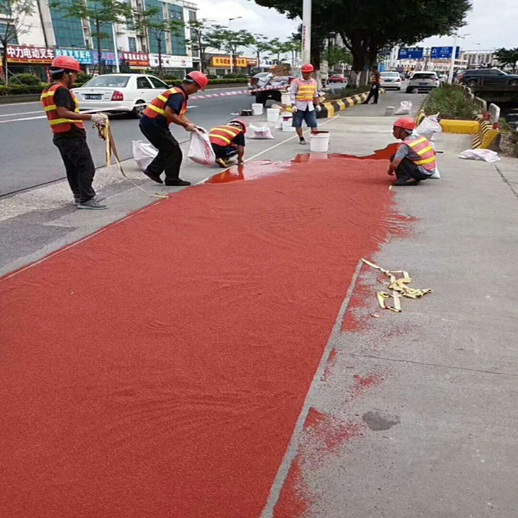 、用透氣型噴面膠與EPDM膠粒、EPDM膠粉按規(guī)定比例配比,攪拌均勻,倒入專用噴涂機中,按順時針和逆時針方向分兩遍到三遍進行噴涂,固化后及為防滑耐磨層,現(xiàn)在普遍使用的顏色為紅色和綠色。