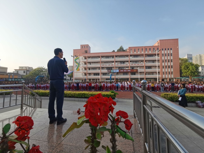 伴隨著雄壯的國歌聲,五星紅旗冉冉升起,拉開了開學(xué)典禮的序幕。蔡長(zhǎng)青校長(zhǎng)作了新學(xué)期開學(xué)致辭,為全校師生開設(shè)了一堂別開生面的開學(xué)第一課。他首先代表學(xué)校對(duì)全體師生致以新年的問候,并回顧了過去的一年我國在各個(gè)領(lǐng)域取得的巨大成就,感恩祖國的偉大進(jìn)步和防疫的良好成效,號(hào)召師生為祖國的繁榮昌盛貢獻(xiàn)力量。與此同時(shí),今年是非同尋常的一年,我國將迎來中國共產(chǎn)黨建黨一百年,同時(shí)也是火炬開發(fā)區(qū)第一小學(xué)建校一百周年。我們要為了迎接建黨和建校的一百周年,在本學(xué)期做好充足的準(zhǔn)備。