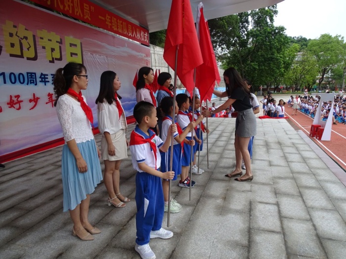 活動伊始,全體師生起立升國旗奏唱國歌,入隊儀式在激昂的《出旗曲》中拉開帷幕。全體同學(xué)共同唱響《中國少年先鋒隊隊歌》。大隊輔導(dǎo)員林慧老師宣讀了新隊員名單。少先隊員代表為同學(xué)們戴上了鮮艷的紅領(lǐng)巾,鮮艷的紅領(lǐng)巾佩戴在他們的胸前時,少先隊員們的臉上洋溢著激動與自豪。在少先隊大隊輔導(dǎo)員林慧老師的帶領(lǐng)下,少先隊員面向隊旗莊嚴(yán)宣誓:我是中國少年先鋒隊隊員,我在隊旗下宣誓:我熱愛中國共產(chǎn)黨,熱愛祖國,熱愛人民,好好學(xué)習(xí),好好鍛煉,準(zhǔn)備著:為共產(chǎn)主義事業(yè)貢獻力量!隨后,該校馮麗芬副校長授隊旗給中隊長,周瑞珍校長給中隊輔導(dǎo)員頒發(fā)聘書。