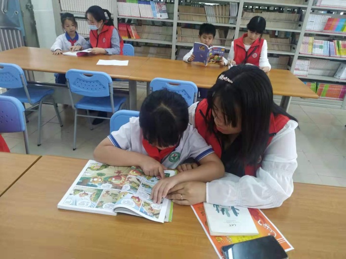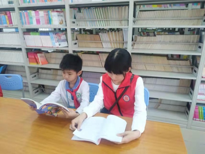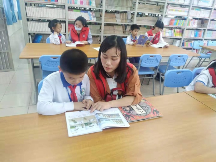 大手拉小手,小小的身影后面跟著一位笑容滿面的家長(zhǎng),兩人從容不迫地走進(jìn)學(xué)校的圖書館。她們雙眼炯炯有神地盯著書架上整齊有序的書本,雙手輕撫書本,最后一人捧著一本自己喜愛的書安靜地坐下。一對(duì)對(duì)親子各自認(rèn)真地閱讀,媽媽時(shí)不時(shí)向女兒介紹黨的成長(zhǎng)之路,女兒時(shí)不時(shí)皺著眉頭輕聲向母親提問(wèn),兒子時(shí)不時(shí)給媽媽普及軍事知識(shí)。溫情又和諧的一幕,令人倍感美好。隨著時(shí)間的流逝,進(jìn)入圖書館的學(xué)生與家長(zhǎng)越來(lái)越多,然而現(xiàn)場(chǎng)并沒有因?yàn)槿硕喽鵁狒[,每一對(duì)親子都安靜地閱讀著手中的書本,輕聲交流心得。
