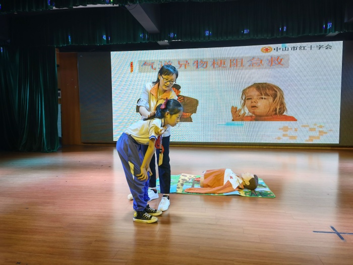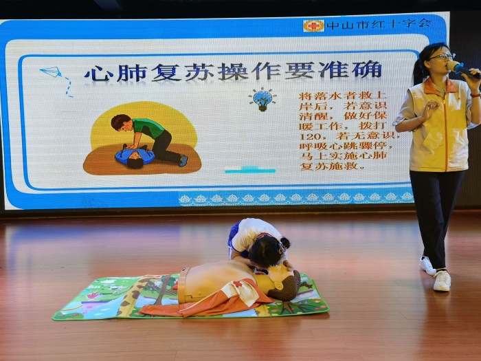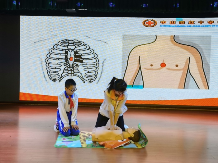 講座中,鄭老師語(yǔ)言生動(dòng)易懂,配合詳細(xì)的PPT展示、問(wèn)答互動(dòng)和現(xiàn)場(chǎng)的模仿操作,現(xiàn)場(chǎng)氣氛十分活躍,學(xué)生們積極參與其中。她尤其重點(diǎn)講解了在實(shí)際救援中,如何抓住最有效的“黃金四分鐘”時(shí)間,開(kāi)展心肺復(fù)蘇救援。鄭老師為了讓模擬更加逼真,她結(jié)合模型,親身給學(xué)生示范如何正確進(jìn)行心肺復(fù)蘇,告訴孩子們心肺復(fù)蘇的正確按壓部位和步驟,并邀請(qǐng)了學(xué)生上臺(tái)模擬。同學(xué)們興趣盎然,部分學(xué)生還上臺(tái)進(jìn)行了互動(dòng)交流,贏得現(xiàn)場(chǎng)掌聲陣陣。講座的最后,鄭老師呼吁同學(xué)們重視生命安全,學(xué)會(huì)科學(xué)施救。會(huì)后中山市紅十字會(huì)還為同學(xué)們分發(fā)了紅十字會(huì)宣傳手冊(cè)。