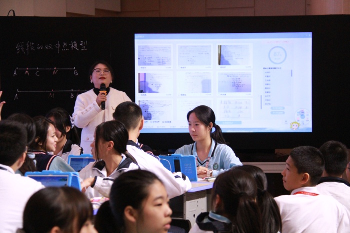 大家移步到一樓報(bào)告廳時(shí),今天一襲白衣,顯得格外溫柔的陳盼老師帶著八班的同學(xué)們已經(jīng)整齊坐好。陳盼老師組織同學(xué)們先用洋蔥學(xué)院進(jìn)行了課前預(yù)習(xí),通過智慧平板在課前進(jìn)行作業(yè)訂正和組內(nèi)答疑,讓學(xué)生對(duì)雙中點(diǎn)模型有了初步的印象。課中,使用Geogebra(動(dòng)態(tài)幾何畫板)進(jìn)行展示,幫助學(xué)生了解雙中點(diǎn)模型。陳老師特別注重小組合作,簡(jiǎn)單的題或知識(shí)點(diǎn)采用小組合作采用對(duì)學(xué)的模式,難度較高的則采用群學(xué)的模式,充分發(fā)揮小組的力量。同時(shí)使用智慧教育平臺(tái),學(xué)生通過平板拍照上傳小組探討結(jié)果,老師及時(shí)收集數(shù)據(jù)、反饋答題結(jié)果,據(jù)此組織教學(xué)重點(diǎn)。班上的小小老師,上臺(tái)展示時(shí),講解清晰,絲毫不怯場(chǎng),也讓人眼前一亮!數(shù)學(xué)課其實(shí)也可以有很多互動(dòng),陳老師與八班的孩子們優(yōu)秀地展示了紀(jì)雅的教學(xué)特色:基于智慧教育初中課堂小組合作學(xué)習(xí)”的教育教學(xué)模式。