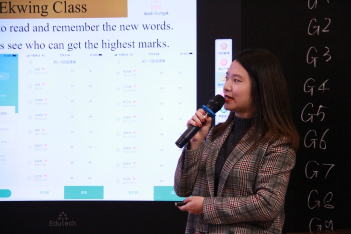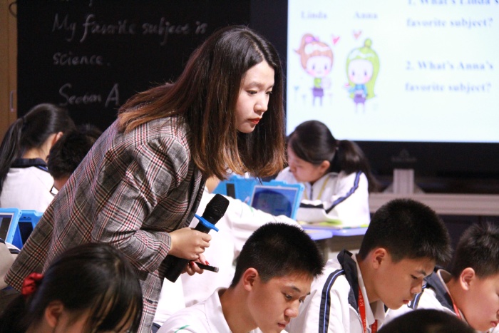 首先初一(7)班同學(xué)們齊聲面對(duì)大家先說了自己班級(jí)口號(hào)。下面的課程中,就不再聽到大家說中文了,真正做到英語課就從一始終用英文來交流。在課前的預(yù)習(xí)任務(wù)中,黎老師使用翼課網(wǎng)布置讀記單詞任務(wù),看誰識(shí)記最快。(所有上課任務(wù)都是實(shí)行加分的)上課開始,黎老師展示了學(xué)習(xí)目標(biāo)。而這堂課的內(nèi)容是:我最喜歡的學(xué)科和老師,所以先展示了同學(xué)們熟悉的各任課老師說英語的視頻,并用任課老師生活照片來提示大家用英文說科目名稱,讓學(xué)生一下就能融入學(xué)習(xí)任務(wù)與環(huán)境中。課中使用智慧課堂平臺(tái)發(fā)送(聽力)練習(xí)或發(fā)送做題任務(wù),學(xué)生拍照上傳答案,及時(shí)反饋?zhàn)鲱}結(jié)果,提高了課堂練習(xí)的效率。黎老師同樣十分注重小組合作,給學(xué)生創(chuàng)造語境,讓學(xué)生小組交流,兩人對(duì)話展示,說說自己最喜歡的科目與老師,以及理由??匆曨l,了解班上其它同學(xué)喜歡哪一位老師與科目。接著以小組合作的形式進(jìn)行語言輸出,互相交流做調(diào)查,并選擇代表展示全組交流結(jié)果。不僅達(dá)到了本節(jié)課教育目標(biāo),同樣體現(xiàn)了學(xué)校特色,為英語課堂的技術(shù)融合提供了經(jīng)驗(yàn)。7班、8班的孩子們?cè)谕藞?chǎng)時(shí),都能做到安靜、有序、有禮貌,體現(xiàn)了紀(jì)雅學(xué)子的素養(yǎng)。