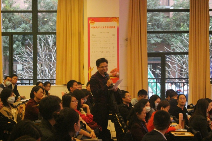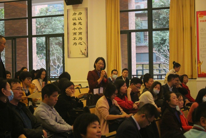 觀摩課結(jié)束,參會(huì)人員集中研討交流,汪和生副院長主持建議來自不同區(qū)的老師能自由點(diǎn)評(píng)一下。來自東莞、中山其他試點(diǎn)校的老師在肯定紀(jì)雅取得優(yōu)秀成果基礎(chǔ)上提出幾點(diǎn)疑惑,如小組合作學(xué)習(xí)的任務(wù)安排與效果評(píng)價(jià),小組文化建設(shè)、班級(jí)文化建設(shè)中的德育與教學(xué)目標(biāo)怎么劃分,英語課如何用信息技術(shù)體現(xiàn)學(xué)生的思維。這些疑惑,王校長自信從容,結(jié)合紀(jì)雅的操作經(jīng)驗(yàn)、現(xiàn)實(shí)做法,輕松地一一作了回答。