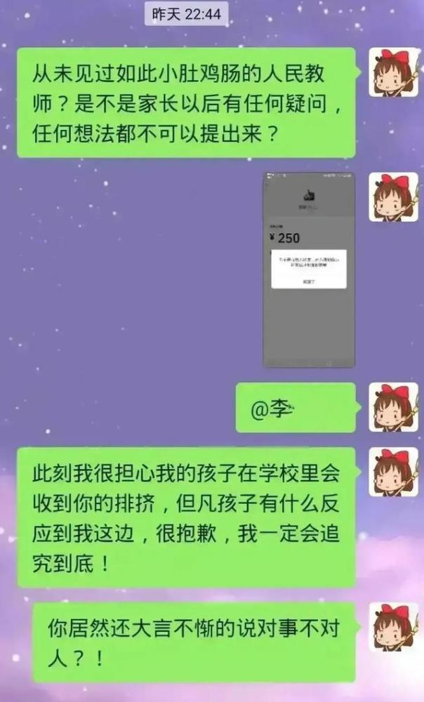 沒(méi)想到事情到這里還沒(méi)完,這位家長(zhǎng)不依不饒,指責(zé)這位老師小肚雞腸,不虛心接受建議,并且表達(dá)出自己擔(dān)心孩子會(huì)得到老師排擠的憂(yōu)慮,但是這不重要,她說(shuō)孩子有任何反映到這邊她都會(huì)追究到底的。