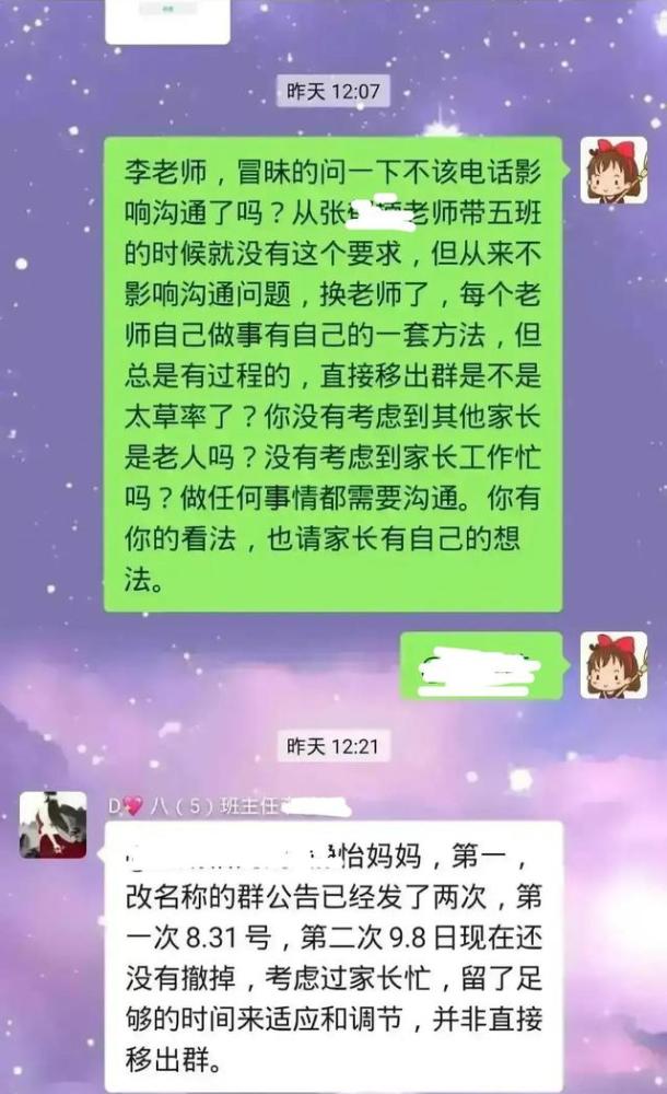 在這位家長(zhǎng)看來(lái),之前的班主任沒(méi)有這樣要求,既然換老師了,家長(zhǎng)和老師磨合需要一個(gè)過(guò)程,直接移出群聊是不是欠妥?