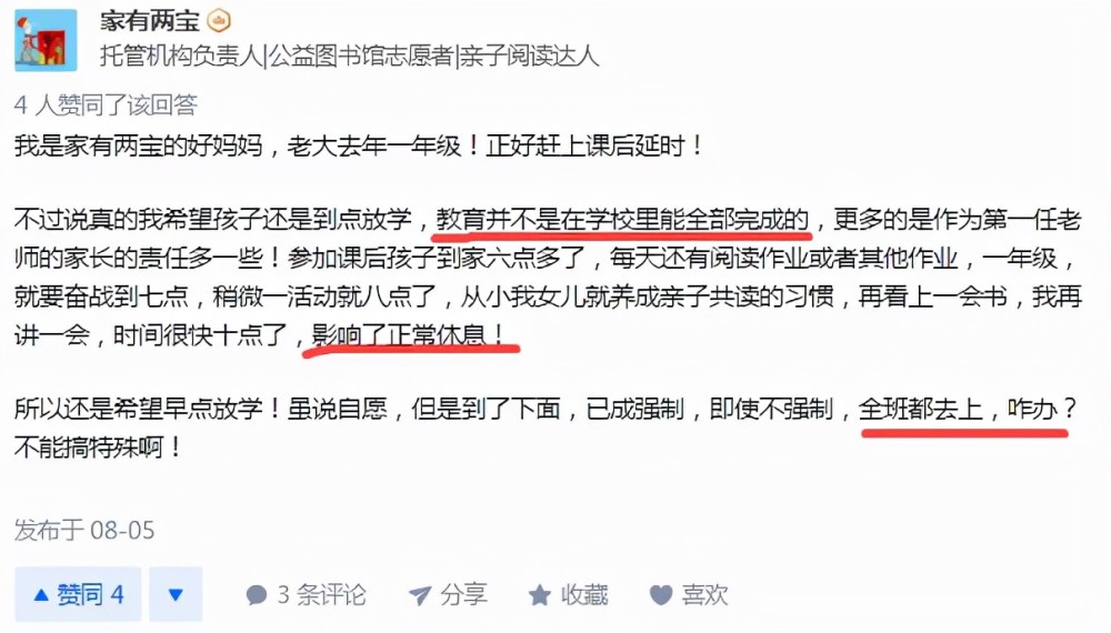 沒想到臨近開學,各中小學相繼發(fā)布課后延時服務細則。由于政策規(guī)定,學校延時服務時間最少不得早于正常放學時間2小時以內(nèi),并且最終放學時間,不得早于學生家長正常下班時間半小時以內(nèi)。