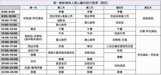 從下圖中的活動(dòng)行程表可以看到,這個(gè)只有短短五天的活動(dòng),刨去第一天和最后一天的行車時(shí)間,以及第四天的歡送會(huì),中間其實(shí)只有兩天的時(shí)間給孩子們“上課”,加起來(lái)滿打滿算也只有7節(jié)課。