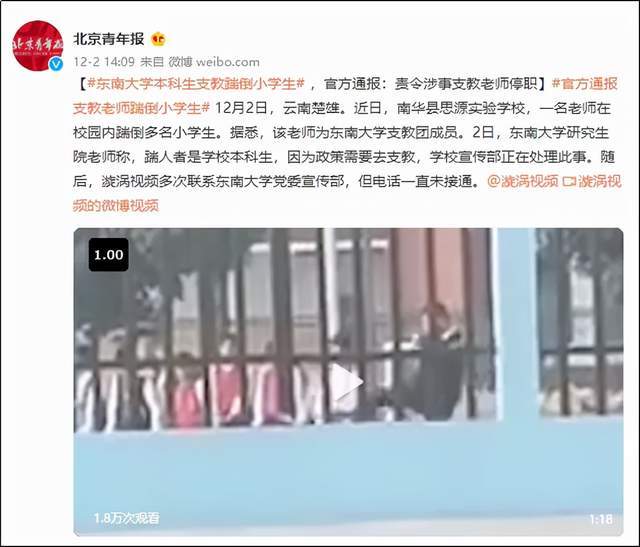 這樣的事情也絕對(duì)不是孤例,去年12月初,“支教老師踹倒小學(xué)生”的新聞也登上了熱搜。