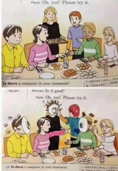 上面的這幅圖是很溫馨的家庭聚餐的英語課本插圖,但是這位學(xué)生卻把盆子畫在三個(gè)人的臉上,還增加了另一個(gè)人,溫馨的聚餐畫面突然變成了家庭鬧劇,仿佛一家人不是在聚餐而是在打架。這位同學(xué)的細(xì)節(jié)也處理的非常好,添加的人物和動(dòng)作在整個(gè)畫面都非常的和諧,一點(diǎn)都不突兀。這位同學(xué)的構(gòu)思很巧妙,以后都可以當(dāng)一名畫家了。