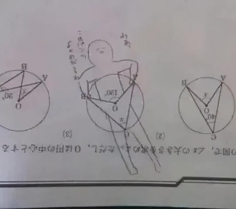 以上的圖畫是在試卷上進(jìn)行創(chuàng)作的,還是數(shù)學(xué)試卷,被同學(xué)在一個(gè)圓的基礎(chǔ)上添加了一個(gè)人,并加上了一個(gè)向下的箭頭,很有超人的那味道。雖然這位同學(xué)畫得特別地樸素,但是這幅簡筆畫人物的小表情和寓意都是有值得欣賞的地方。