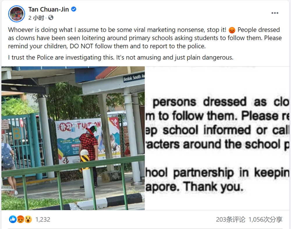 昨天下午,新加坡國(guó)會(huì)議長(zhǎng)陳川仁在Facebook發(fā)文透露,這些小丑在校外游蕩,疑似是一家教育中心的宣傳策略,并對(duì)這樣的宣傳手法進(jìn)行強(qiáng)烈譴責(zé)。