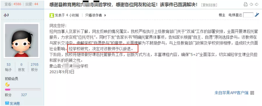 隨后,學(xué)校官網(wǎng)上給出正式回應(yīng),表示已經(jīng)辭退了這名老師。至此,這名語(yǔ)文老師就成了公然與雙減政策叫板后被辭退的“第一人”。