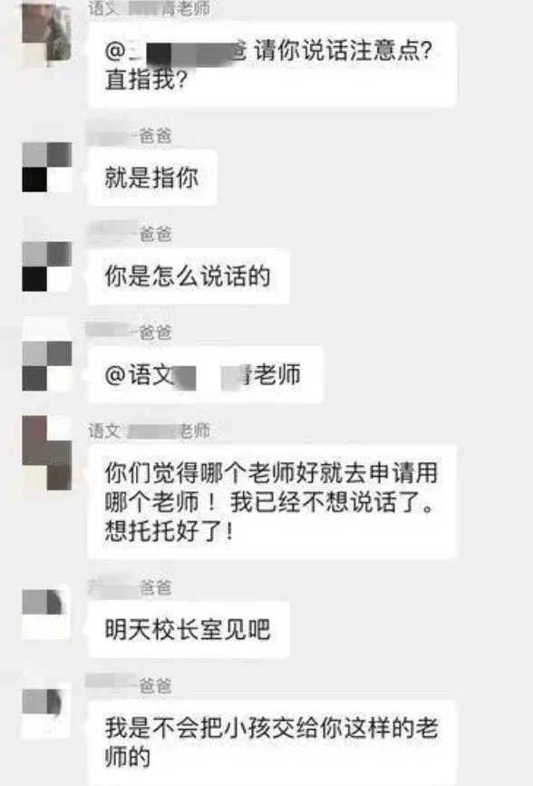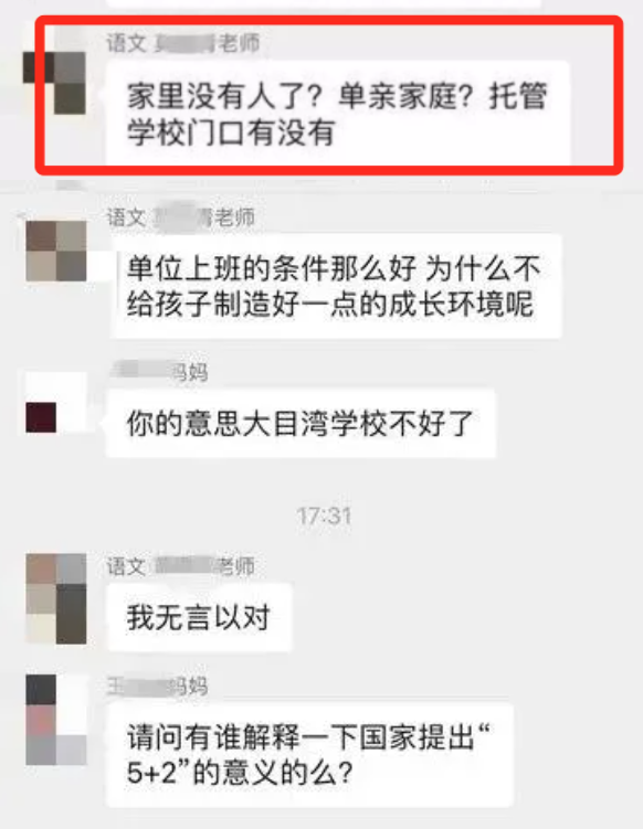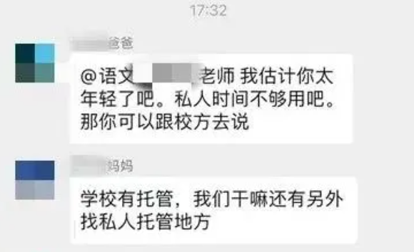 眼看著各地學(xué)校都在開(kāi)展延時(shí)服務(wù),這個(gè)班家長(zhǎng)很不解,這本來(lái)是讓家長(zhǎng)自由選擇的事,怎么突然畫(huà)風(fēng)變了,變成老師勸大家都不要參與了呢?于是有家長(zhǎng)在群里提出意見(jiàn),表示3點(diǎn)35分那些正在工作的家長(zhǎng)根本沒(méi)辦法來(lái)接孩子。好吧,這一句話不知怎么的就點(diǎn)燃了這位老師的火,她接下來(lái)說(shuō)的話就很不中聽(tīng)了,她直接在群里對(duì)所有家長(zhǎng)說(shuō)“家里沒(méi)有人了?單親家庭?托管學(xué)校門(mén)口有沒(méi)有?”