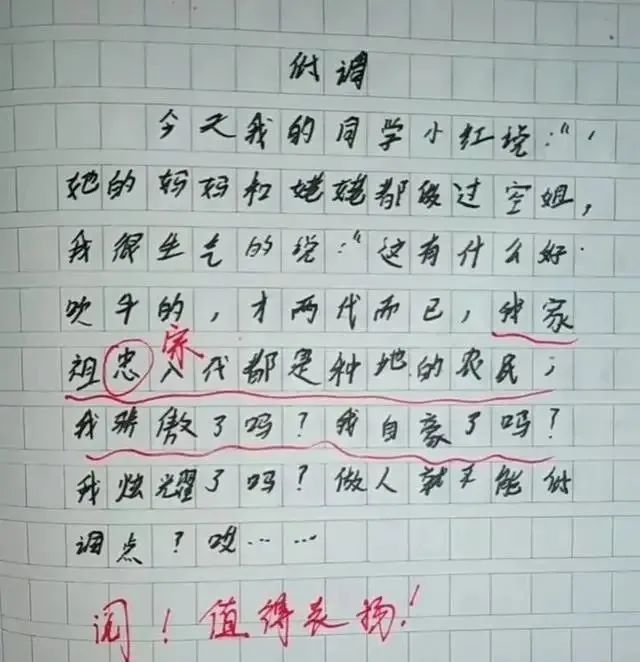 同學(xué)說自己姥姥和媽媽都是當(dāng)空姐的,該作者不服氣寫出:“這有什么好驕傲的,你家這才兩代而已,我家祖宗八代都是種地的我驕傲了嗎?”網(wǎng)友看到小學(xué)生犀利的話語不禁笑出聲:“八代農(nóng)民就是傲嬌??!”