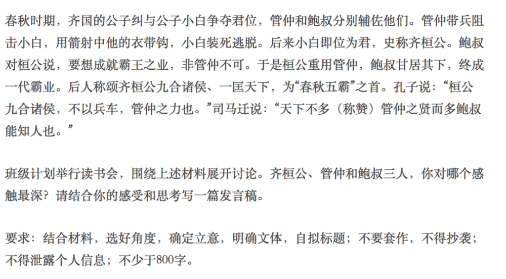 這道作文題中涉及到3個人,很多人會選擇鮑叔,因為他甘居人下的品格。也有很多人會選擇齊桓公,因為他不計前嫌,敢任用曾經(jīng)想殺自己的管仲。
