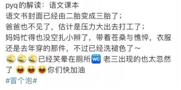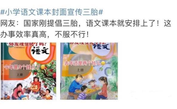 對(duì)此,在一結(jié)合小學(xué)語(yǔ)文教材封面所傳遞出的信息,有很多網(wǎng)友猜測(cè)可能是和三胎政策有關(guān),相關(guān)部門(mén)為了提倡三胎政策才對(duì)封面進(jìn)行了改變。