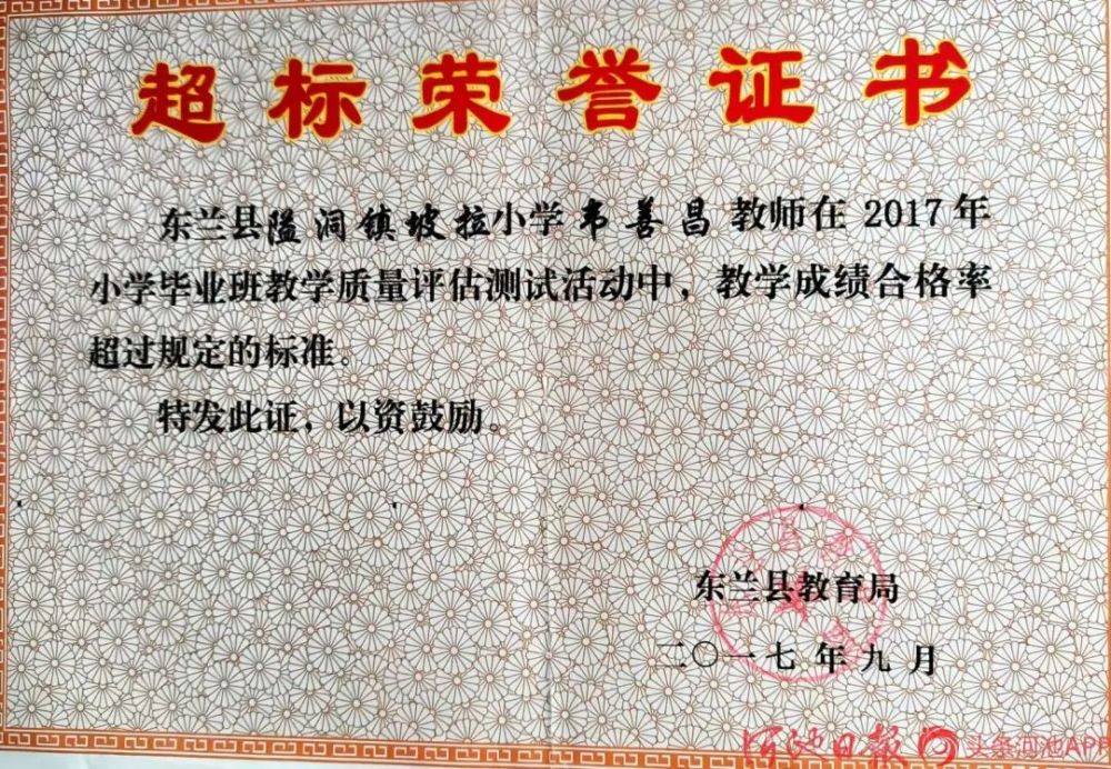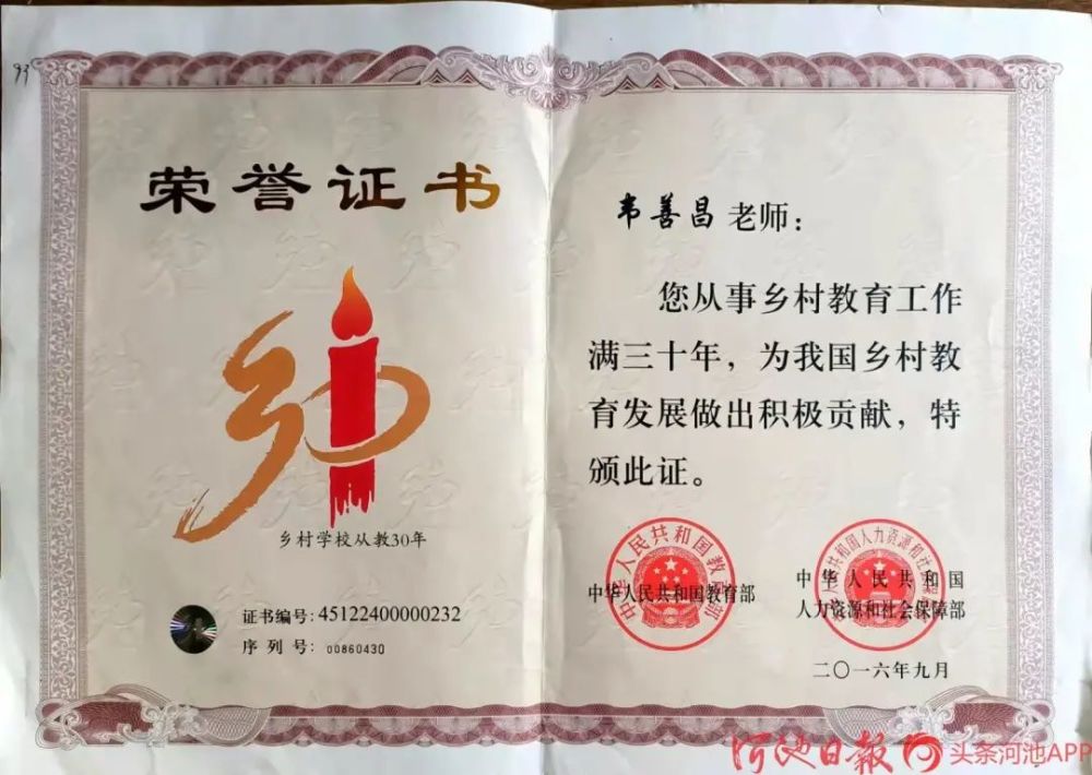 37年來,韋善昌在鄉(xiāng)村教師的崗位上嚴(yán)格要求自己,并獲得多項(xiàng)縣級、市級、國家級榮譽(yù)。2016年9月,他榮獲教育部、人力資源和社會(huì)保障部聯(lián)合頒發(fā)的“鄉(xiāng)村學(xué)校從教30年教師榮譽(yù)證書”。