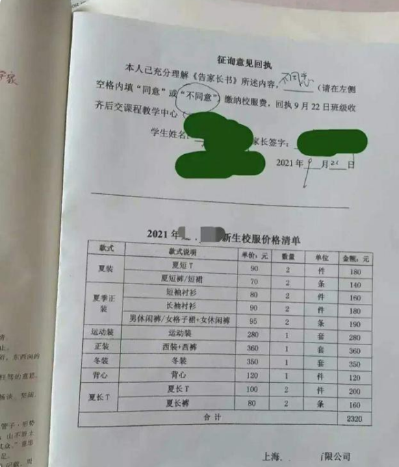 但是上海的一位家長,卻對學校訂購校服的事情并不認同,在孩子帶回來的告家長書上直接簽上了“不同意”三個字,引發(fā)網友熱議。