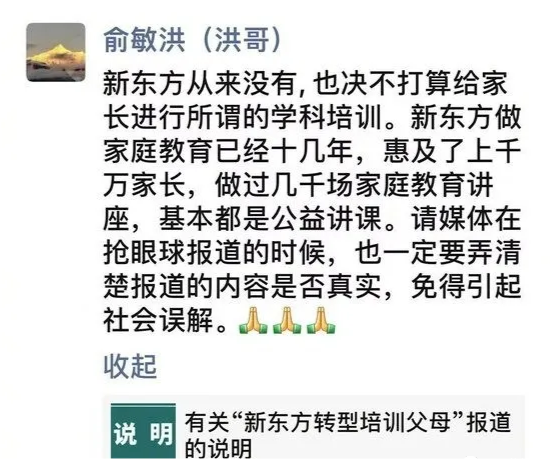 其實(shí)大家完全沒(méi)必要這么慌,這不國(guó)家還沒(méi)說(shuō)啥,俞敏洪就扛不住了,趕緊出來(lái)澄清:“目前做的只是針對(duì)家長(zhǎng)的公益講座,新東方從來(lái)沒(méi)有,也絕不打算給家長(zhǎng)進(jìn)行培訓(xùn)?!?/p>