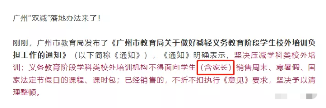 來(lái)一起看看廣州雙減關(guān)于這一條的政策:《廣州市教育局關(guān)于做好減輕義務(wù)教育階段學(xué)生校外培訓(xùn)負(fù)擔(dān)工作的通知》明確表示:義務(wù)教育階段學(xué)科類校外培訓(xùn)機(jī)構(gòu)不得面向?qū)W生(含家長(zhǎng))銷售周末、寒暑假、國(guó)家法定節(jié)假日的課程、課時(shí)包;