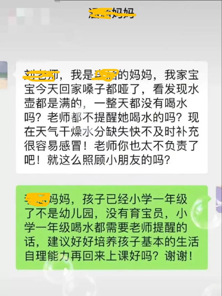 看到對方語氣這么沖,自己也不服輸,回懟:一年級不是幼兒園,沒有育寶員,如果連喝水都需要老師提醒的話,建議好好培養(yǎng)孩子基本的生活自理能力再回來上課。