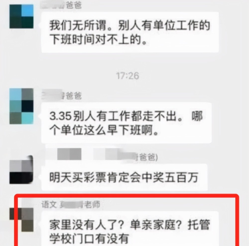 班主任這樣的發(fā)言,也讓很多家長(zhǎng)明白了過(guò)來(lái),這就是變相勸退,不想讓孩子上課后延時(shí)班。有家長(zhǎng)表示自己來(lái)不及接孩子放學(xué),可能要參加課后延時(shí)服務(wù)。這個(gè)是侯老師開(kāi)始出言諷刺:“你家沒(méi)人了?你單親家庭”?