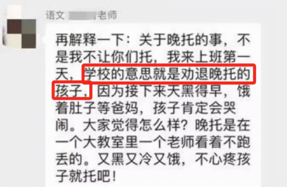 并且旁敲側(cè)擊表示,嚴(yán)苛延時(shí)服務(wù)就是將孩子們丟在一個(gè)“大教室里面”,而且會(huì)“又黑又冷又餓”,老師將學(xué)校的教室形容得如此不堪,并且還表示,如果家長(zhǎng)不心疼孩子,那就進(jìn)行晚托吧。