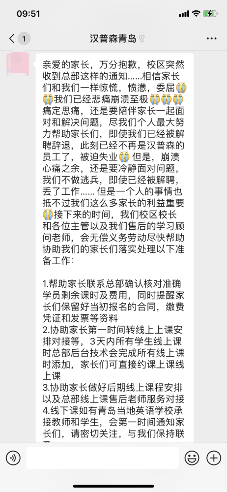 學(xué)校陷入了完全沒有收入的境地,新學(xué)員不敢報名,老的學(xué)員要么大批量要求退費,要么不再續(xù)費和轉(zhuǎn)介紹。作為曾經(jīng)青島市大眾點評外語培訓(xùn)機(jī)構(gòu)第一名的青島漢普森學(xué)校難以為繼。