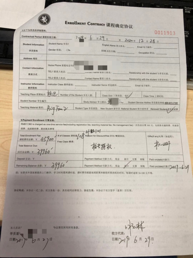 另一位家長于女士說,她也是給孩子報了課,總共交了4萬多元,9月22日才通知開課。9月23日就關(guān)門了,孩子一節(jié)課也沒上過。他們現(xiàn)在找學(xué)校退費,校長的電話一直打不進(jìn)去,許多老師也已經(jīng)辭職,不再負(fù)責(zé)。漢普森英語收費較高,有些家長的學(xué)費甚至10萬多。如今他們都網(wǎng)課登不上,線下退費找不到人的難題。