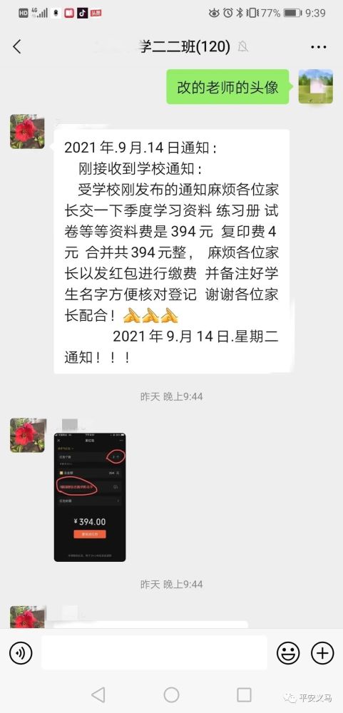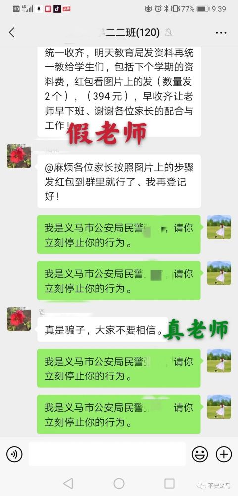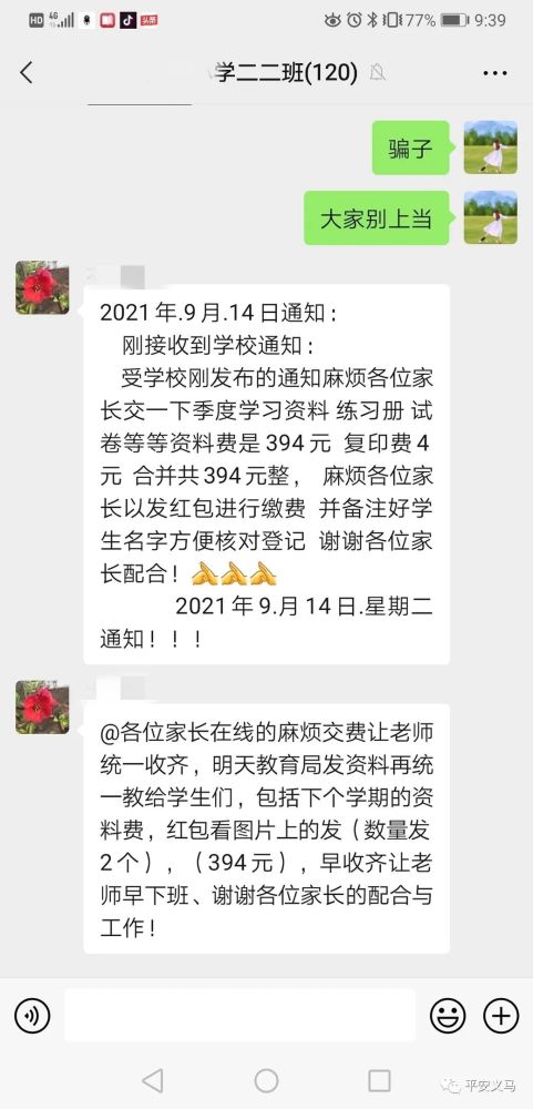 9月14日晚9點(diǎn)39分,在我市某小學(xué)家長微信群里,突然出現(xiàn)了第二個班主任,這位“班主任”發(fā)布了一份以假亂真的學(xué)校通知,要求每位家長以發(fā)紅包備注名字的方式上交學(xué)習(xí)資料費(fèi)共計(jì)394元。只是這位“假班主任”萬萬沒想到,群里的學(xué)生家長中“藏”著真警察。不到一分鐘的時間,騙術(shù)被揭穿,家長群里上演了一幕“教科書式”反詐行動。