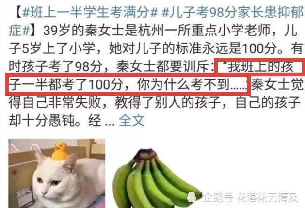 一位杭州39歲的媽媽是一所重點(diǎn)小學(xué)的老師,兒子五歲上小學(xué),他對(duì)兒子的標(biāo)準(zhǔn)永遠(yuǎn)是100分,有時(shí)孩子考了98分,秦女士就會(huì)訓(xùn)斥,我班上的孩子一半都考了100分,你為什么考不到?她覺得自己很失敗,患有嚴(yán)重的抑郁癥。