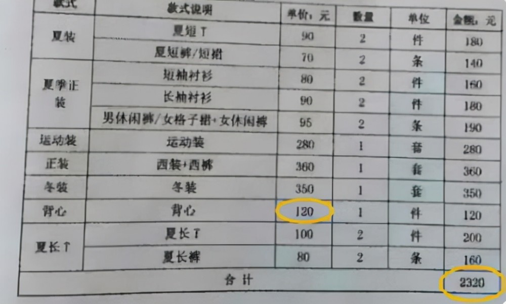可能是怕小學(xué)生表達(dá)不清楚,學(xué)校特地把校服的明細(xì)打印了出來(lái),從校服繳費(fèi)單中我們可以看到,大大小小的校服一共18件,最便宜的短裙、短褲是70一件,而最貴的是冬裝,需要350一套,總共加起來(lái)是2320元的校服費(fèi)用。