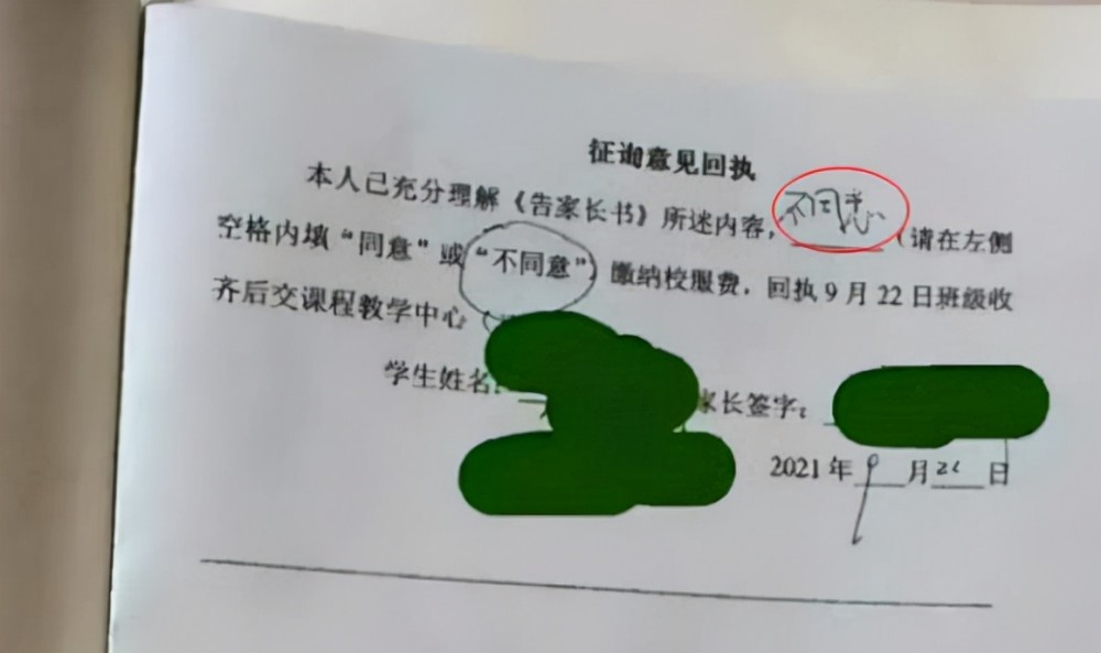 2000多塊,對(duì)于上海的普通家庭來(lái)說(shuō),并不算很多,但是一所普通小學(xué)的校服就要一次性繳納上千元,明顯是超出了很多家長(zhǎng)的預(yù)期,于是這位“勇敢”的家長(zhǎng)在校服繳費(fèi)的回執(zhí)單上,霸氣的簽字“不同意”,還特地在單子上把這三個(gè)字圈了出來(lái)。
