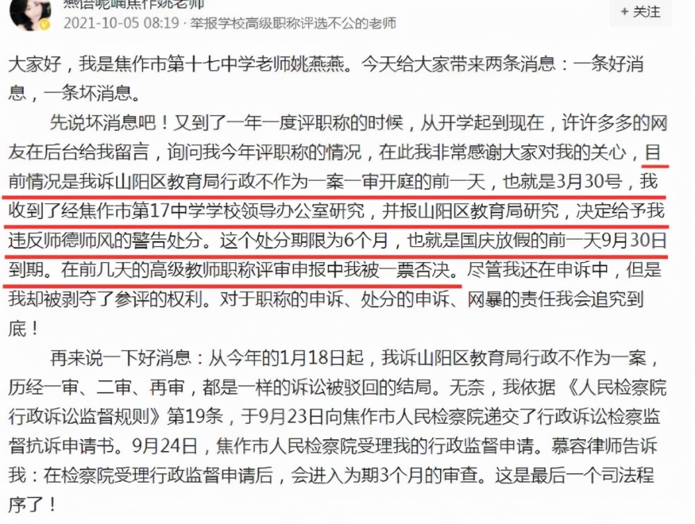 女教師姚燕燕申報(bào)高級(jí)職稱,被學(xué)校一票否決
