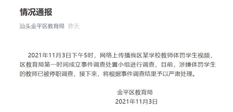 11月3日,汕頭金平區(qū)教育局官方賬號(hào)針對(duì)該視頻發(fā)布情況通報(bào)。通報(bào)中稱,區(qū)教育局第一時(shí)間成立事件調(diào)查處理小組進(jìn)行調(diào)查,目前涉嫌體罰學(xué)生的教師已被停職調(diào)查,接下來(lái)將根據(jù)事件調(diào)查結(jié)果予以嚴(yán)肅處理。