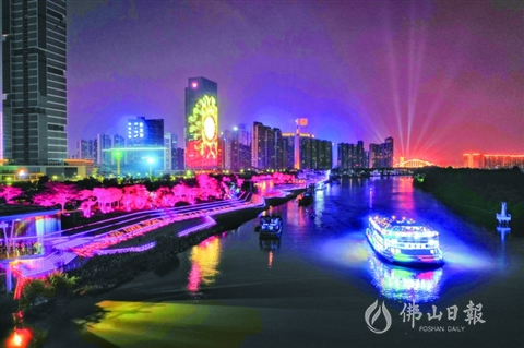 三龍灣游船行經(jīng)流光溢彩的東平水道龍舟廣場段。/佛山日報記者張弘弢攝