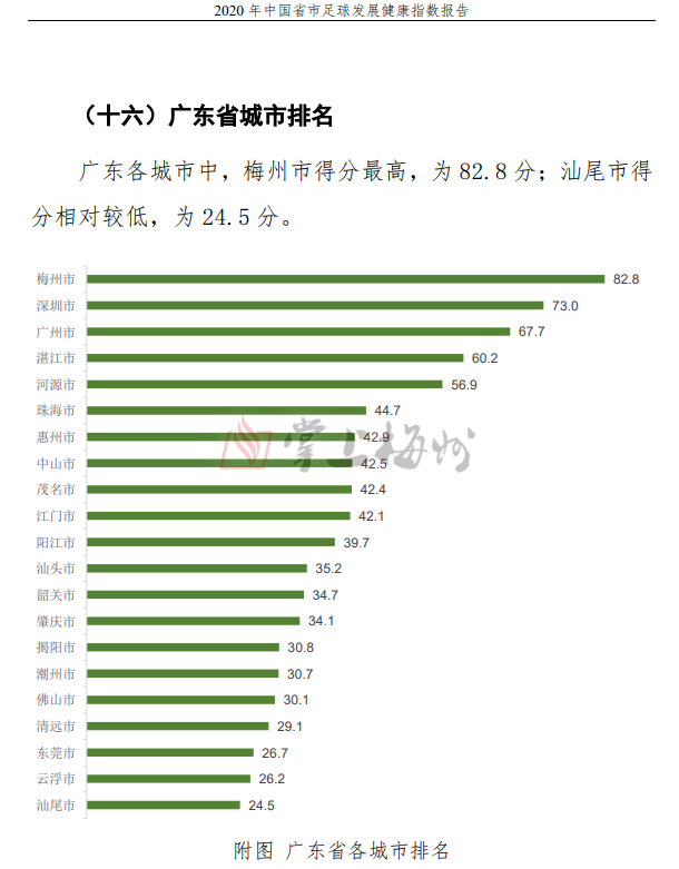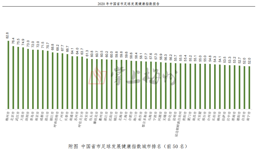 15日,中國足協(xié)發(fā)布《2020年中國省市足球發(fā)展健康指數(shù)報(bào)告》,報(bào)告指出,根據(jù)指標(biāo)體系計(jì)算得出,百分制下,2020年中國省市足球發(fā)展健康指數(shù)城市排名,梅州市82.8分排名第一,其次是北京市和武漢市。前十還有大連市、深圳市、青島市、南京市、成都市、眉山市、麗江市。