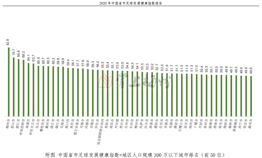 報(bào)告根據(jù)人口規(guī)模對(duì)1000萬以上城市、300萬-1000萬,300萬以下城市進(jìn)行了評(píng)分排名。報(bào)告指出,2020年中國省市足球發(fā)展健康指數(shù)全國總得分為40.6分,總體處于較低水平。