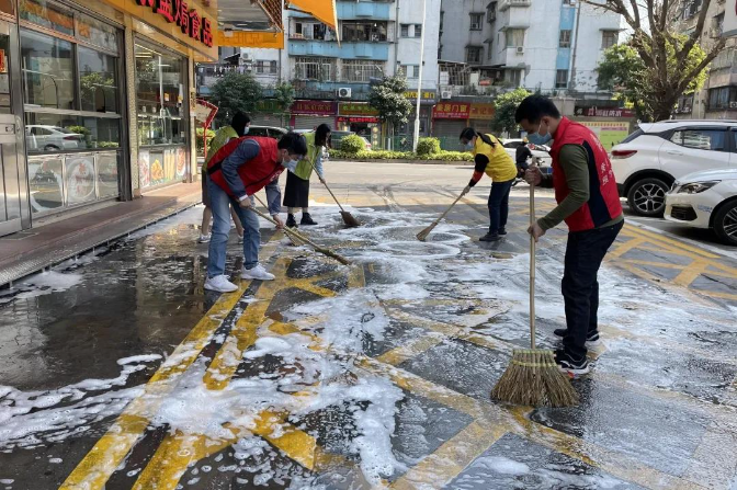 活動中,黨員志愿者、村(居)工作人員、駐點工作組、群眾督導員穿上紅、黃、綠馬甲,手持鋼絲球、掃帚、火鉗等勞動工具,清理市場周邊衛(wèi)生黑點,小公園內(nèi)外、大街小巷兩旁的垃圾以及隨意張貼的“牛皮癬”。