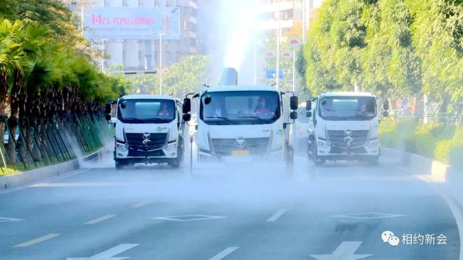 在岡州大道的道路清潔現(xiàn)場,多功能清掃車、高壓清洗車和抑塵車聯(lián)合作業(yè),設(shè)備一邊行進,一邊清掃、吸塵、灑水、高壓沖洗、噴霧,實現(xiàn)快速、高效清洗,又有效防止二次揚塵。