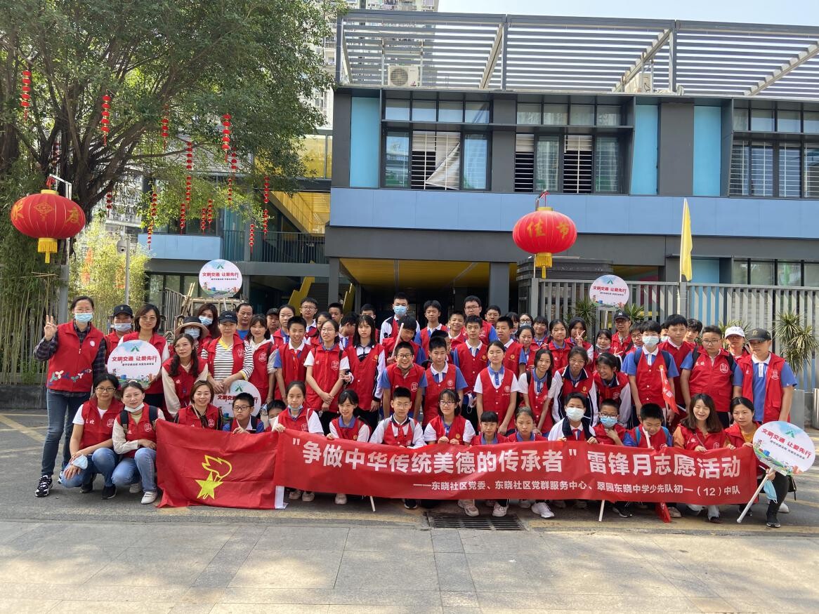 為了深入學(xué)習(xí)雷鋒精神,提高未成年人思想道德建設(shè)。2021年3月20日上午,在東曉社區(qū)黨委、翠園東曉中學(xué)家委及東曉社區(qū)黨群服務(wù)中心的共同努力下,開(kāi)展了“爭(zhēng)做中華傳統(tǒng)美德的傳承者”雷鋒月志愿活動(dòng),翠園東曉中學(xué)少先隊(duì)初一(12)班共有54名同學(xué)及15位家長(zhǎng)參與了本次活動(dòng)。