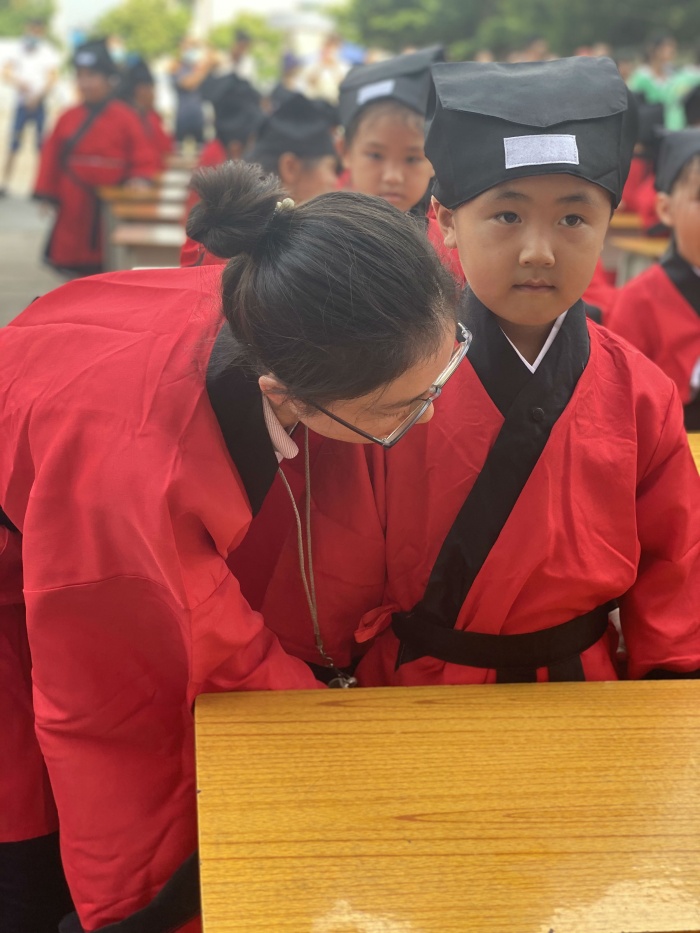 在悅耳的音樂(lè)聲中,同學(xué)們跨進(jìn)智慧門(mén),“正衣冠”、“朱砂啟智”、“擊鼓鳴志”、“啟蒙描紅”……感受學(xué)習(xí)的樂(lè)趣、養(yǎng)成良好的學(xué)習(xí)習(xí)慣。