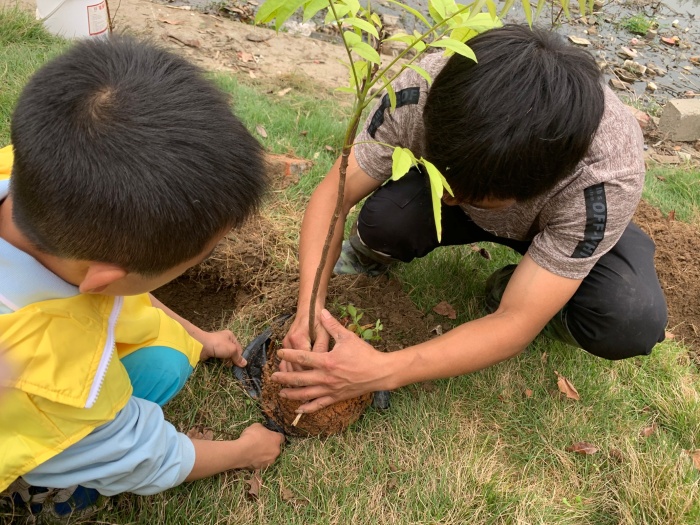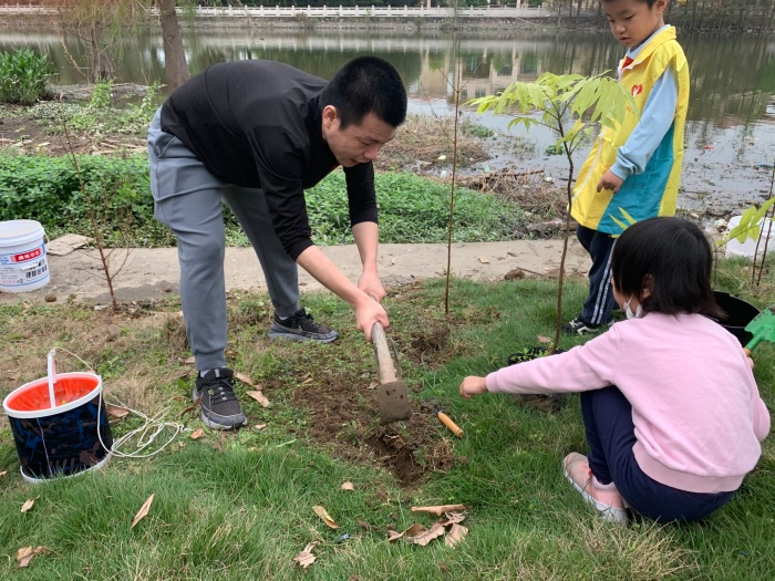 孩子們在家長、老師的指導下完成揮鍬挖坑、扶樹栽苗、鏟土平坑、提桶澆水……場面熱鬧且秩序井然。一鍬一鏟一瓢之間,每個人臉上洋溢著的勞動的喜悅構成了一幅明麗的畫。一棵棵小樹苗在微風中搖動,那是孩子們汗水的凝結。今天種下的小小樹苗,相信定會茁壯成長,為美化城市、保護地球貢獻自己的一份力量!本次植樹志愿活動在家委、社區(qū)的聯(lián)動策劃下應運而生,學校、家庭、社區(qū)三方聯(lián)動,構建和諧的育人網絡。