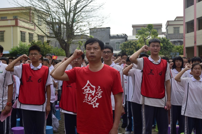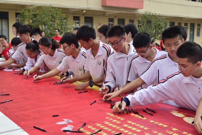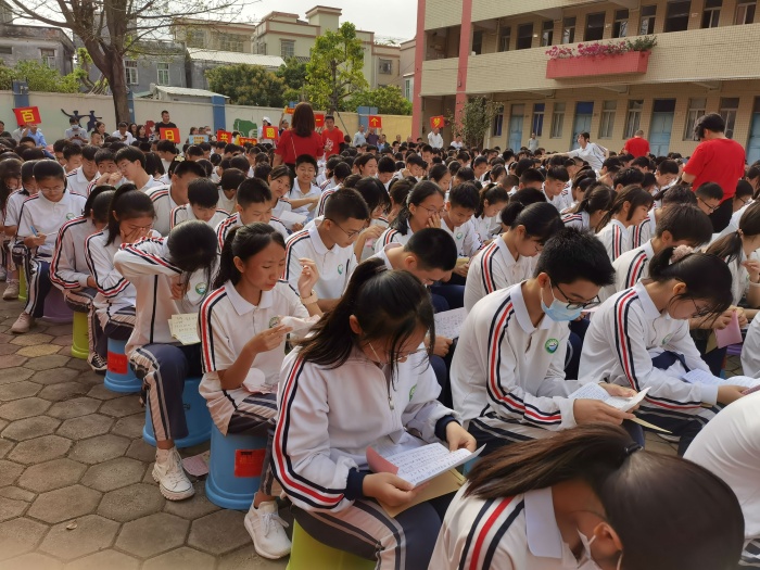 之后,一封來自父母精心準備的信遞到每個初三學生的手中,看著父母的書信,學生們流下了感動的熱淚,父母以最真摯無私的語言觸動了學生們的心。港口鎮(zhèn)黨委委員羅希京也對初三學子提出希望:希望初三學生以考入名校的學長學姐為榜樣,學習“苦心人,天不負,臥薪嘗膽,三千越甲可吞吳”的精神,奮戰(zhàn)百天,蟾宮折桂。最后,全體初三學子莊嚴宣誓,并在奮戰(zhàn)百日奮戰(zhàn)書上簽名。