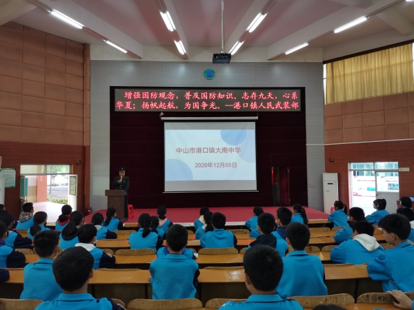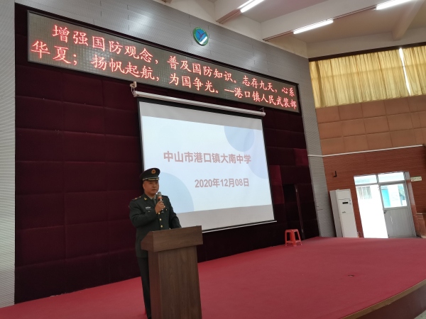 為進(jìn)一步普及國(guó)防知識(shí),增強(qiáng)學(xué)生的國(guó)防觀念,培養(yǎng)學(xué)生的愛(ài)國(guó)主義精神,2020年12月8日港口鎮(zhèn)大南中學(xué)在階梯室舉行了國(guó)防教育知識(shí)講座。此次講座由港口鎮(zhèn)人民武裝部副部長(zhǎng)賀洪彪同志主講。