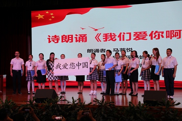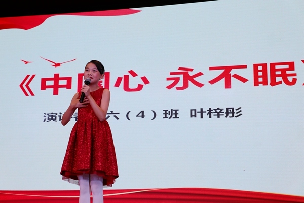 本次比賽由朱漢釗同學主持,7名年級家委和老師共同擔任評委。共有7名選手參賽,選手們以《志存高遠,少年強國》《中國心,永不眠》《國歌情懷》等為主題。比賽中,每位選手激情昂揚,自信滿滿,他們用自己真摯的情感、激昂的文字,贊美了中國人民在抗擊新冠疫情中同心協(xié)力、共渡難關(guān)的偉大壯舉,歌頌了偉大祖國的日新月異和繁榮富強,暢談了在祖國母親的哺育下茁壯成長的感受,抒發(fā)了少年兒童對偉大祖國的無限熱愛,表達了自己為祖國美好的明天而努力奮斗的愿望。除此之外,7位參賽選手的家人也來到了現(xiàn)場為自己的孩子加油鼓氣。他們或揮毫潑墨,或深情朗誦,或用歌聲去傳遞那份濃濃的愛。隨后,六年級師生同臺朗誦《我們愛你啊,祖國》,表達純真的愛國情懷。而大合唱《國歌》和《我和我的祖國》更是把現(xiàn)場氣氛推向了高潮。師生們、家委們揮動著自己手中的小紅旗,用歌聲去贊美祖國。整個會場洋溢著濃濃的愛國情。