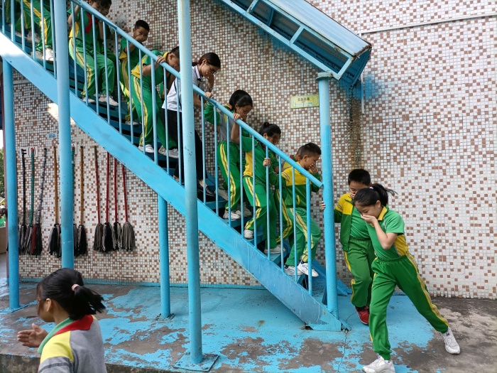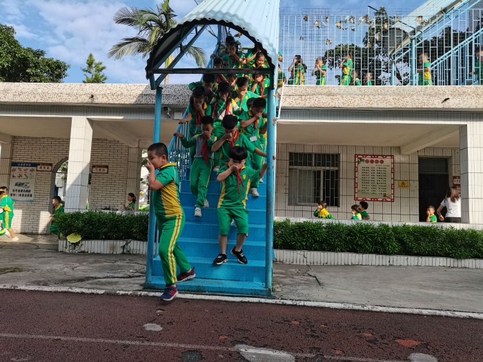 同學們在老師的指揮下,用手捂住口鼻、護頭、彎腰、雙肘撐開平放胸前保證呼吸暢順;按照疏散信號、疏散路線、疏散順序避難,不擁擠、不推搡、不彎腰拾物、更加不逆流行;若有人摔倒時,要馬上停下并大聲呼救,告訴后面不要向前,自己摔倒時要盡快爬起;同學們迅速有秩序,一個接著一個快速安全撤離到集合點后并蹲下,同時兩手十指交叉相扣護住后腦和頸部。老師到達集合點后,立刻清點人數(shù)并向總指揮報告。