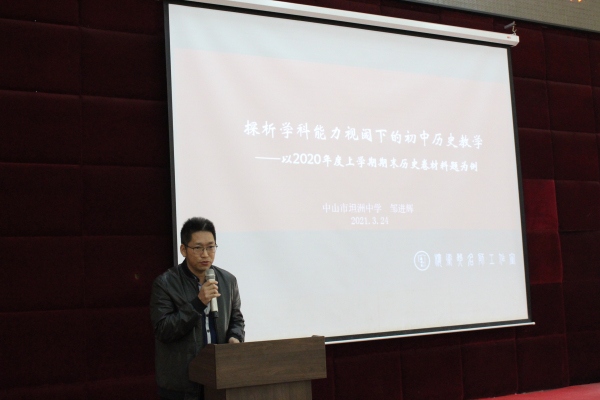 中山市坦洲中學的鄒進輝老師以2020-2021年度上學期期末歷史卷材料題為例,講述了“探析學科能力視閾下的初中歷史教學”。他講到,歷史學科能力成為考查的重要手段!他從什么是歷史學科能力、歷史學科能力考查在期末考試卷中的體現(xiàn)與啟示、中山市期末卷與廣東省中考卷的對照、學科能力視閾下的中考備考策略探討以及學科能力視閾下基礎(chǔ)年級的教學設(shè)問策略探討等五個問題進行了深入地闡述,給與會者極大的啟示。